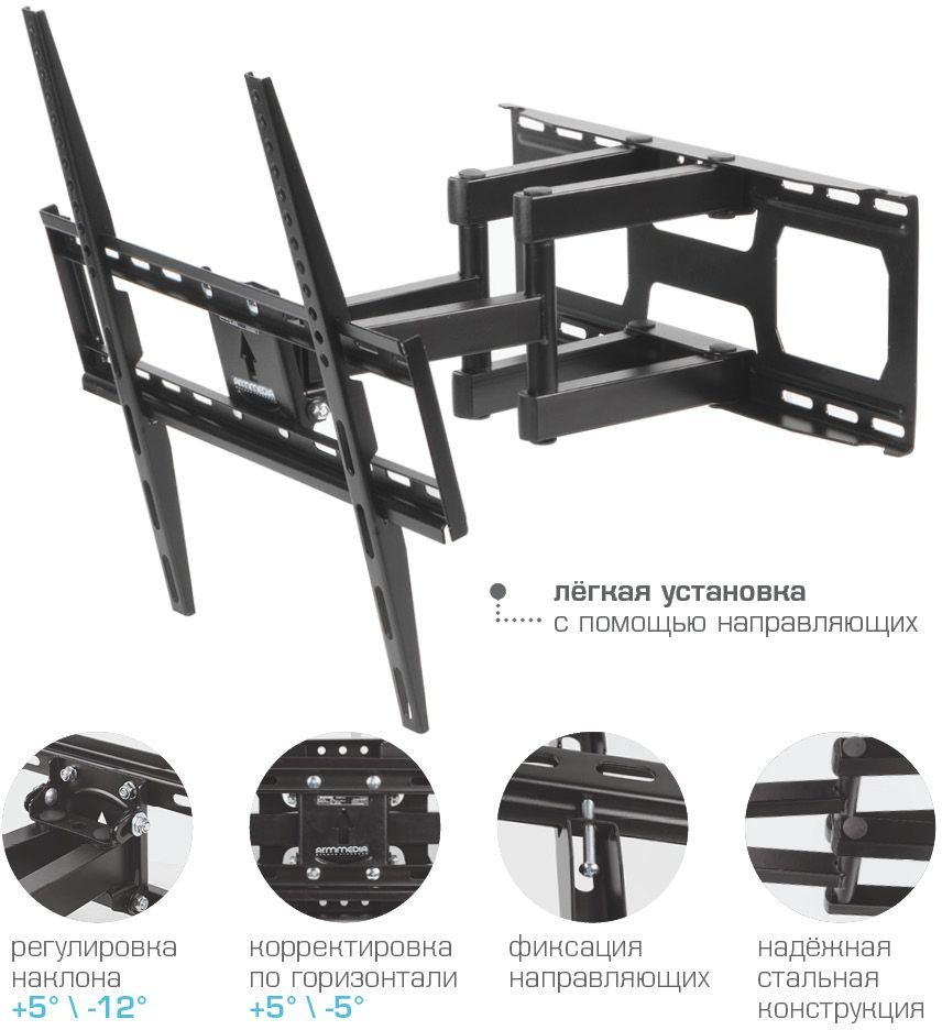 | Особенности: | Усиленная стальная конструкция, Универсальный-телевизор на кронштейне можно наклонить, повернуть и сдвинуть к стене, Широкая монтажная пластина обеспечивает надежное крепление ТВ на стену, Легкий монтаж телевизора, Корректировка экрана ±5° |
